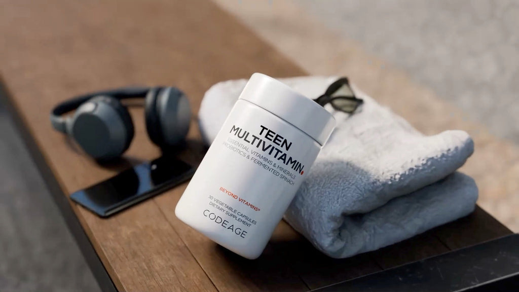 Codeage Teen Multivitamin provides a blend of essential vitamins, minerals, and probiotics tailored for teenagers. This vegan, non-GMO formula features fermented spinach leaf powder and includes key nutrients such as Vitamins A, C, D3, B6, B12, folate, magnesium, zinc, and iron. Crafted for teens aged 12 and older, suitable for both boys and girls.
