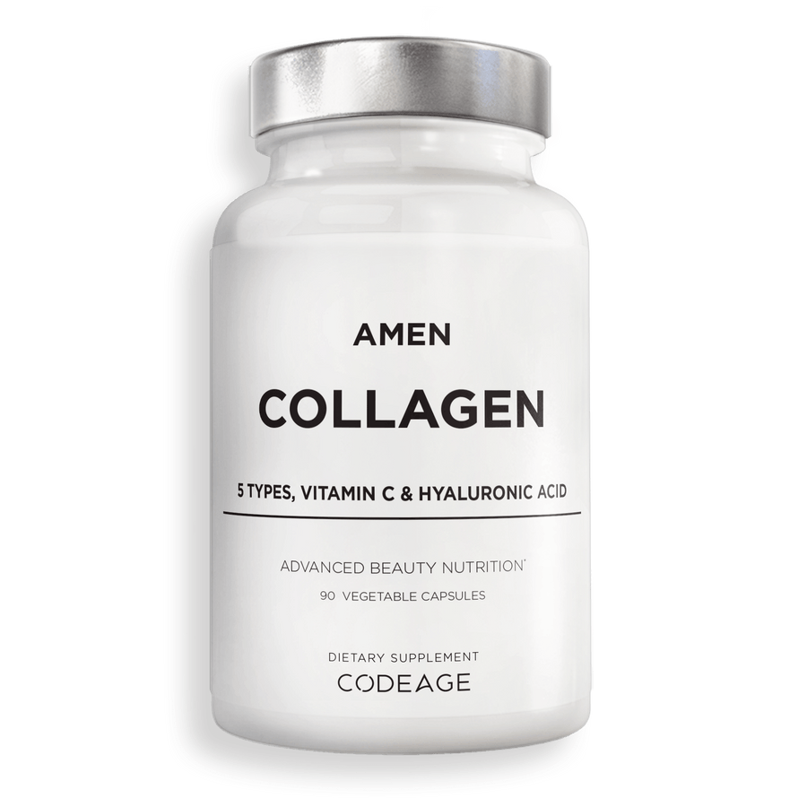 - Amen Collagen capsules supplement includes 5 types of collagen (Type I, II, III, V, and X) in one formula. The collagen comes from premium sources, including grass-fed hydrolyzed bovine collagen peptides, organic chicken bone broth collagen, and eggshell membrane collagen. This product is free from shellfish.