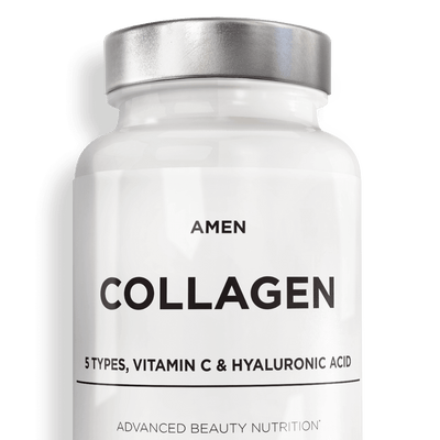 Amen multi collagen capsules supplement features 5 types of collagen, vitamin C, and hyaluronic acid for a comprehensive and convenient collagen formula.