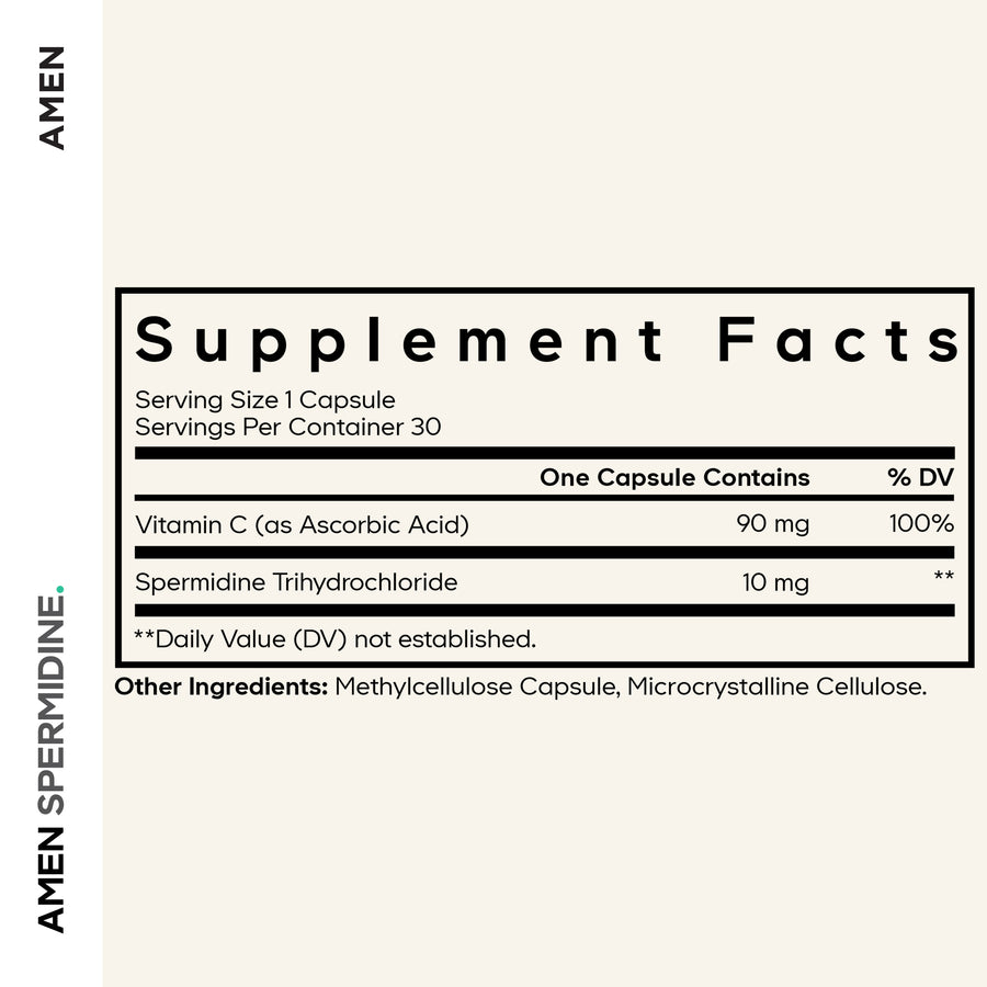 - Each bottle of Amen Spermidine offers 30 capsules for a 1-month supply.