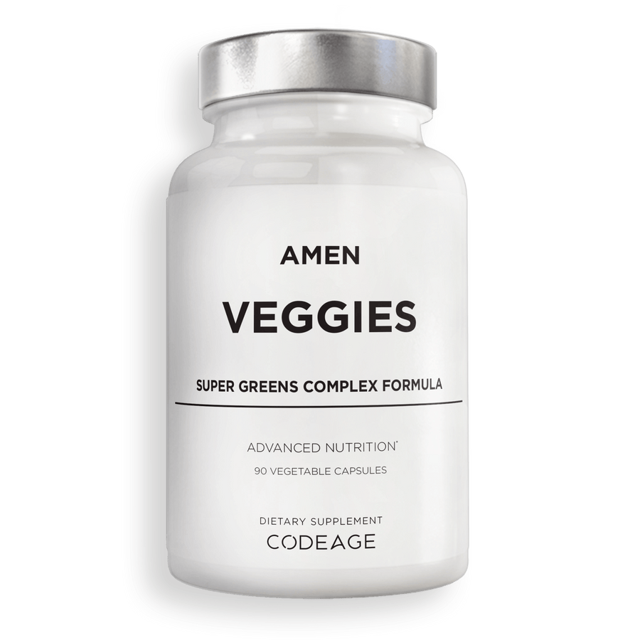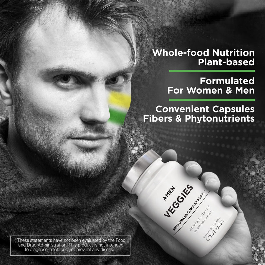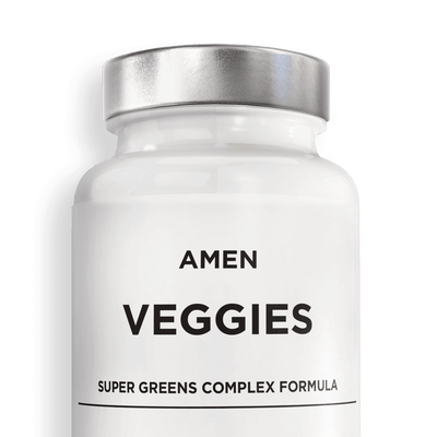 Amen Veggies offers a blend of dark green raw vegetables, mushroom powders, and herbal extracts for a modern source of whole vegetables, daily greens vitamins, fibers, phytonutrients, and minerals in a convenient capsule format.