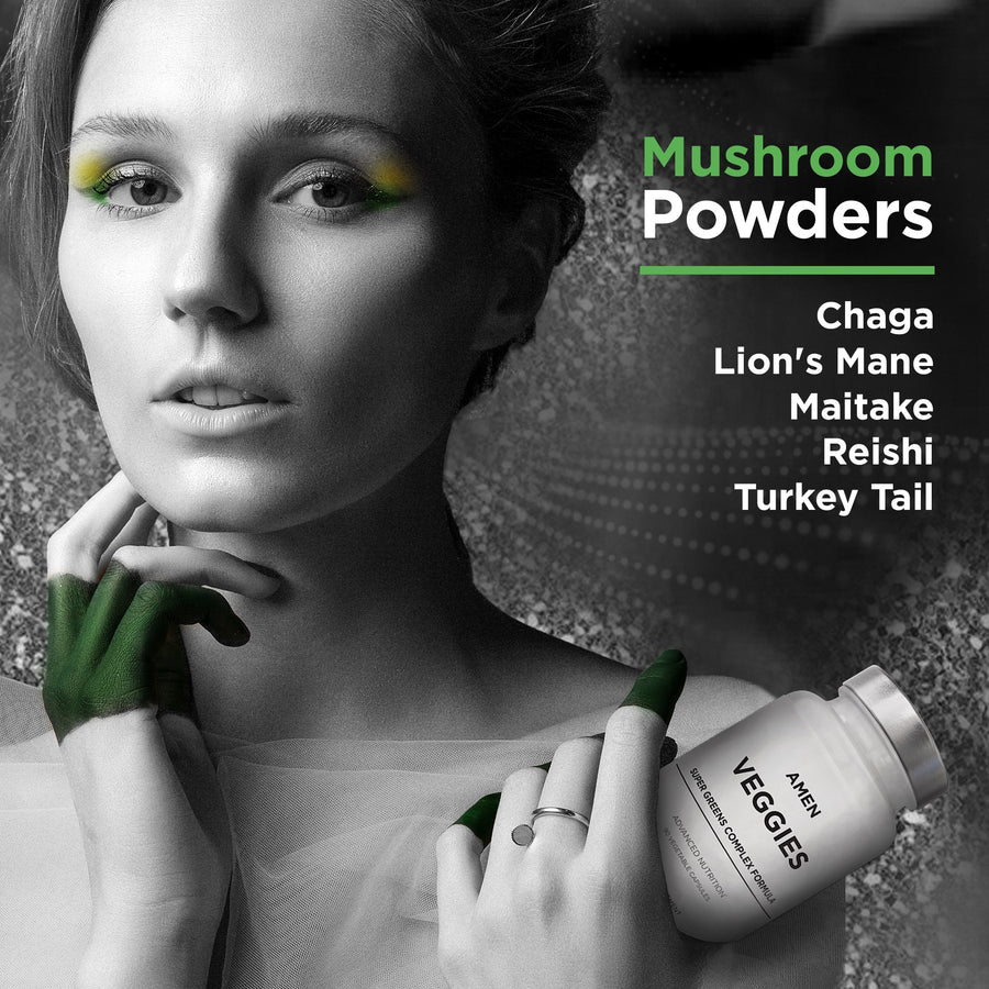 - Amen Veggies also features Maitake and Chaga mushroom powders alongside Reishi, Lion's Mane, and Turkey Tail mushroom extracts.