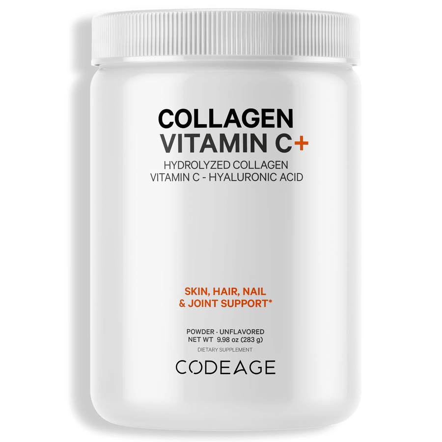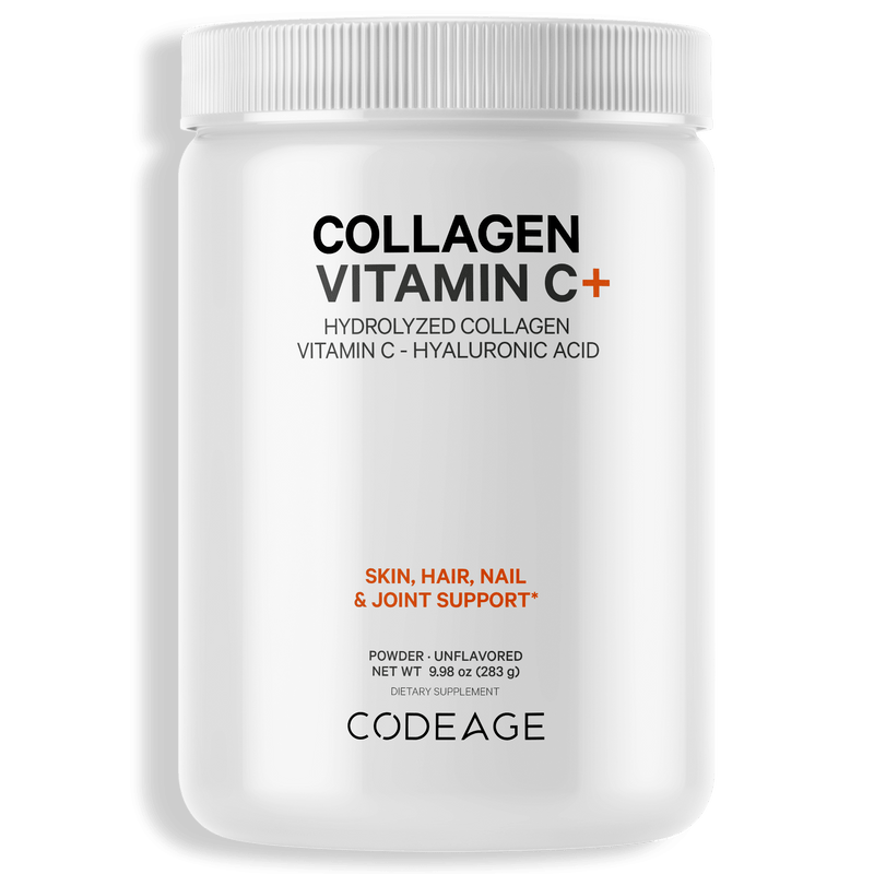 Enhance your collagen regimen with Codeage Collagen Vitamin C+ supplement powder, featuring 20g of grass-fed collagen per serving, paired with Vitamin C, hyaluronic acid, 18 amino acids, and digestive enzymes for a well-rounded collagen supplement.