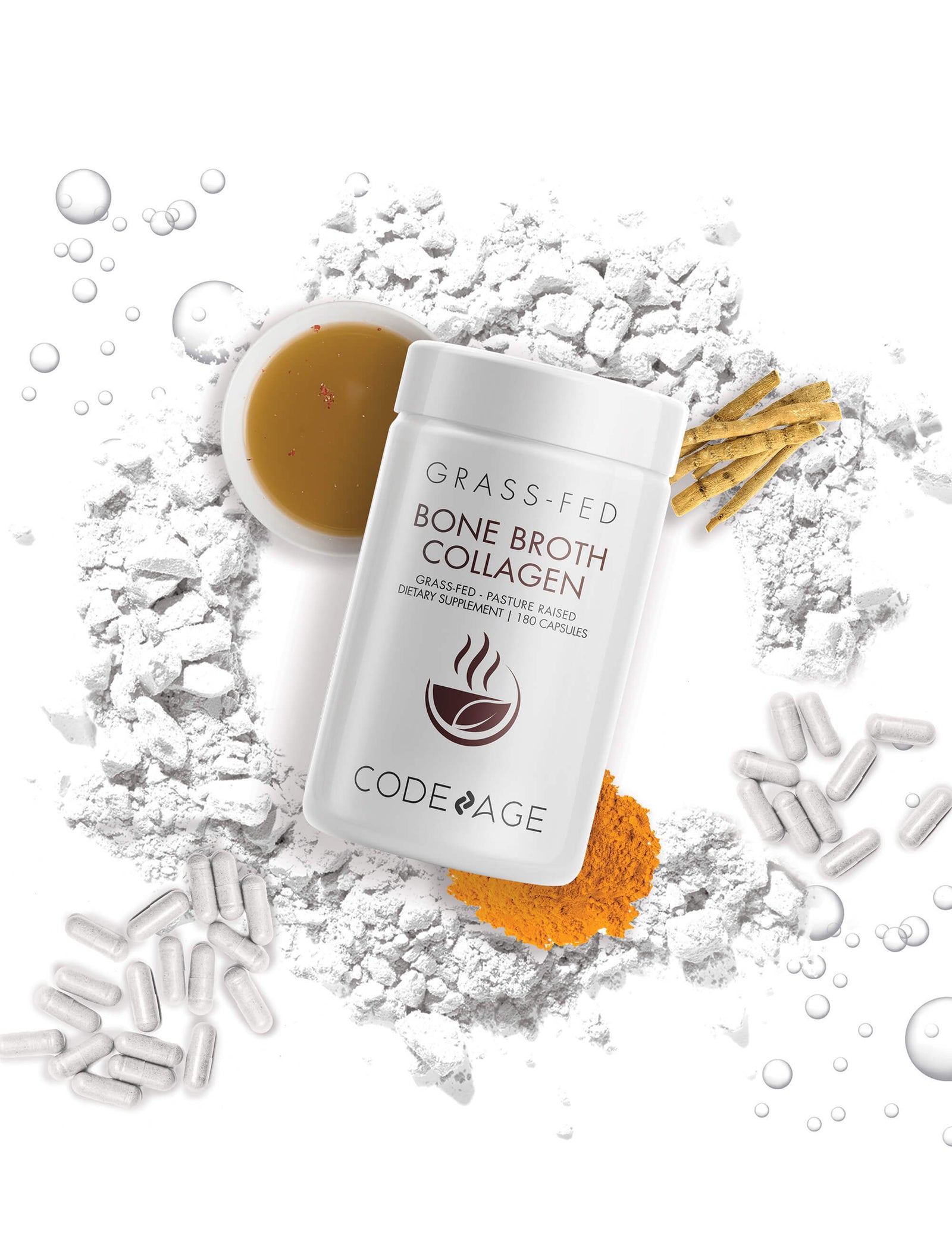 Codeage Grass-Fed Bone Broth Collagen supplement combines organic, pasture-raised beef and free-range chicken collagen, offering a blend of collagen types 1, 2, and 3. Enhanced with organic turmeric, ashwagandha, and amla berry extract.
