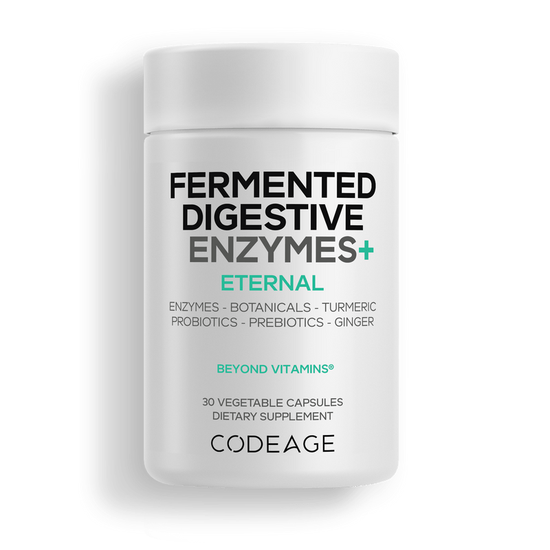 Codeage Fermented Digestive Enzymes is a comprehensive supplement that combines 14 different food enzymes, probiotics, prebiotics, and organic botanicals such as apple cider vinegar, black pepper, ginger, kiwi, and turmeric.