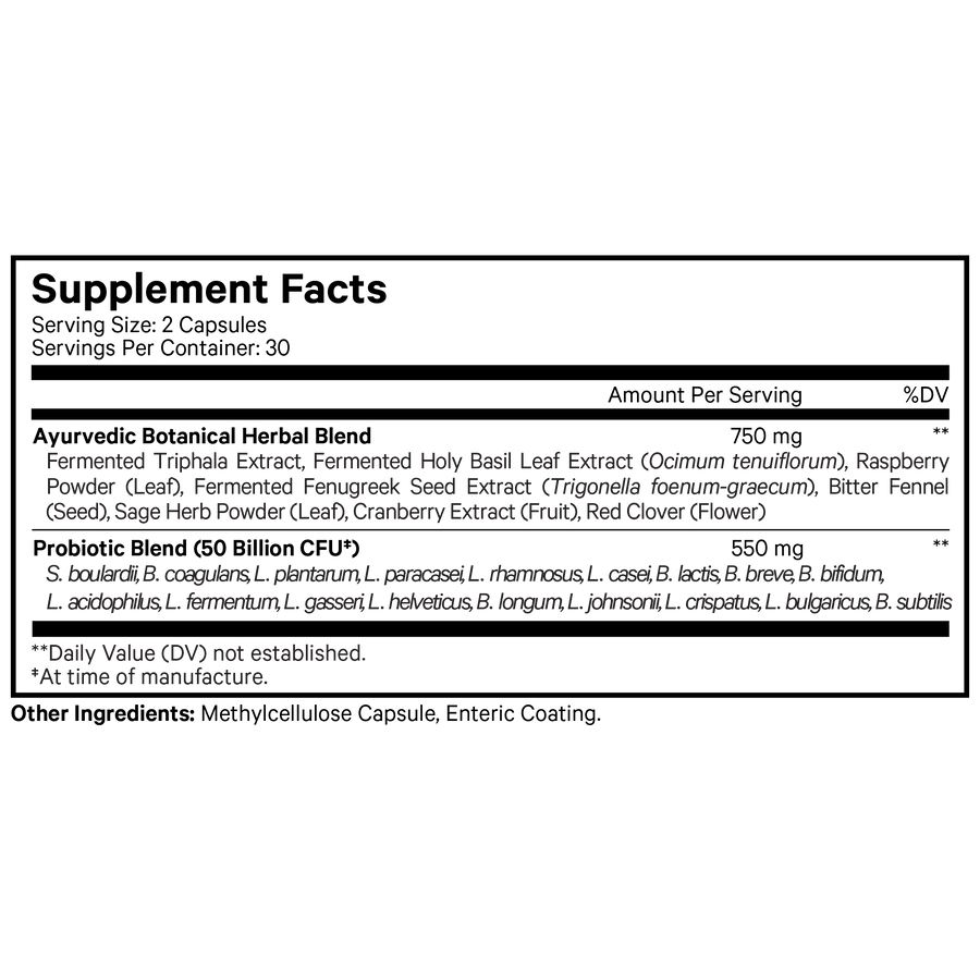 Ayurvedic Botanical Herbal Blend: Fermented Triphala Extract (Emblica officinalis, Terminalia bellirica, and Terminalia chebula; Fruit), Fermented Holy Basil Leaf Extract (Ocimum tenuiflorum), Raspberry Powder (Leaf), Fermented Fenugreek Seed Extract (Trigonella foenum-graecum), Bitter Fennel (Seed), Sage Herb Powder (Leaf), Cranberry Extract (Fruit), Red Clover (Flower); Probiotic Blend (50 Billion CFU‡): S. boulardii, B. coagulans, L. plantarum, L. paracasei, L. rhamnosus, L. casei, B. lactis, B. breve, B. bifidum, L acidophilus, L. fermentum, L. gasseri, L. helveticus, B. longum, L. johnsonii, L. crispatus, L. bulgaricus, B. subtilis. Other Ingredients: Methylcellulose Capsule, Enteric Coating.