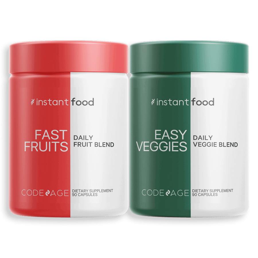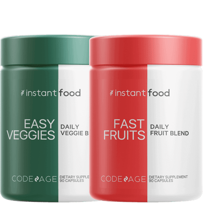 Instantfood Easy Veggies & Fast Fruits supplements combine over 30 whole fruit and vegetable powders in a convenient capsule supplement. Designed to offer a modern approach to daily nutrition, these supplements help to provide vitamins, minerals, and phytonutrients. Each bundle includes one bottle of Instantfood Fast Fruits and one bottle of Instantfood Easy Veggies.