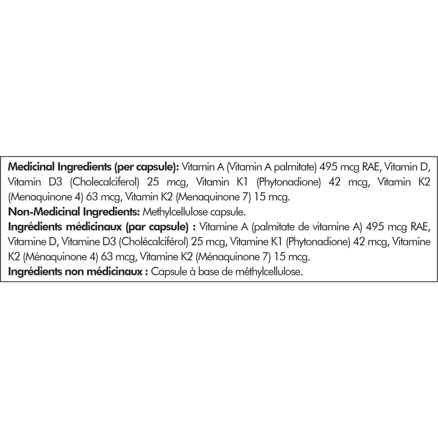 Ingredientes medicinales (por cápsula): Vitamina A (Palmitato de vitamina A) 495 mcg RAE, Vitamina D, Vitamina D3 (Colecalciferol) 25 mcg, Vitamina K1 (Fitonadiona) 42 mcg, Vitamina K2 (Menaquinona 4) 63 mcg, Vitamina K2 (Menaquinona) 7) 15 mcg. Ingredientes no medicinales: Cápsula de metilcelulosa.