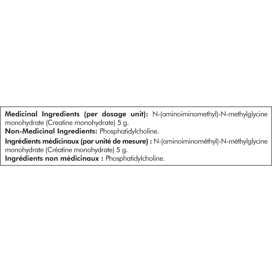 Ingredientes medicinales (por unidad de dosificación): Monohidrato de N-(aminoiminometil)-N-metilglicina (monohidrato de creatina) 5 g. Ingredientes no medicinales: fosfatidilcolina.