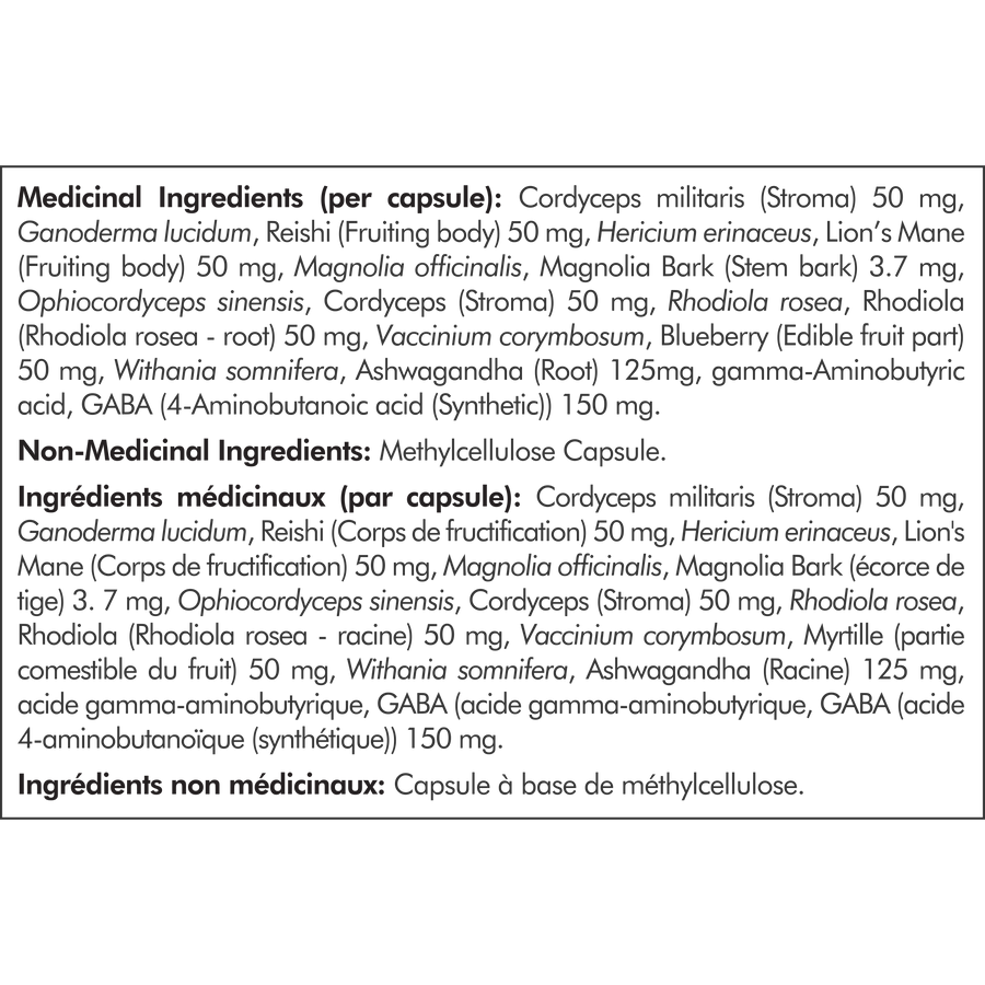 Ingredientes medicinales (por cápsula): Cordyceps militaris (estroma) 50 mg, Ganoderma lucidum, Reishi (cuerpo fructífero) 50 mg, Hericium erinaceus, melena de león (cuerpo fructífero) 50 mg, Magnolia officinalis, corteza de magnolia (corteza del tallo) 3,7 mg. Ophiocordyceps sinensis, Cordyceps (Stroma) 50 mg, Rhodiola rosea, Rhodiola (Rhodiola rosea - raíz) 50 mg, Vaccinium corymbosum, Arándano (Parte comestible del fruto) 50 mg, Withania somnifera, Ashwagandha (Raíz) 125 mg, Ácido gamma-aminobutírico, GABA (Ácido 4-aminobutanoico (Sintético)) 150 mg. Ingredientes no medicinales: Cápsula de metilcelulosa.