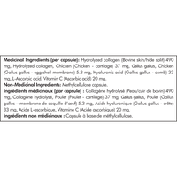 Ingredientes medicinales (por cápsula): Colágeno hidrolizado (piel bovina/piel dividida) 490 mg, Colágeno hidrolizado, Pollo (Pollo - cartílago) 37 mg, Gallus gallus, Pollo (Gallus gallus - membrana de cáscara de huevo) 5,3 mg, Ácido hialurónico (Gallus gallus - peine) 33 mg, Ácido L-Ascórbico, Vitamina C (Ácido Ascórbico) 20 mg. Ingredientes no medicinales: Cápsula de metilcelulosa.
