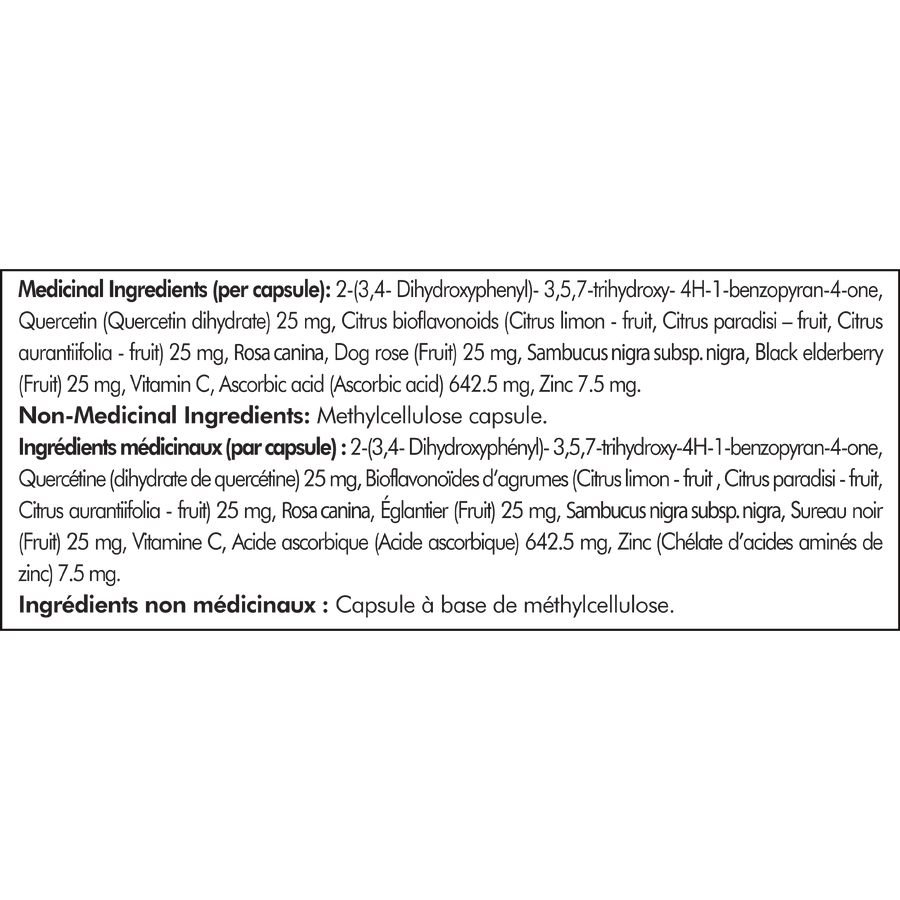 Ingredientes medicinales (por cápsula): 2-(3,4-dihidroxifenil)-3,5,7-trihidroxi-4H-1-benzopiran-4-ona, quercetina (quercetina dihidrato) 25 mg, bioflavonoides cítricos (Citrus limon - fruta , Citrus paradisi – fruta, Citrus aurantiifolia - fruta) 25 mg, Rosa canina, Escaramujo (Fruta) 25 mg, Sambucus nigra subsp. nigra, Saúco negro (Fruta) 25 mg, Vitamina C, Ácido ascórbico (Ácido ascórbico) 642,5 mg, Zinc 7,5 mg. Ingredientes no medicinales: Cápsula de metilcelulosa.