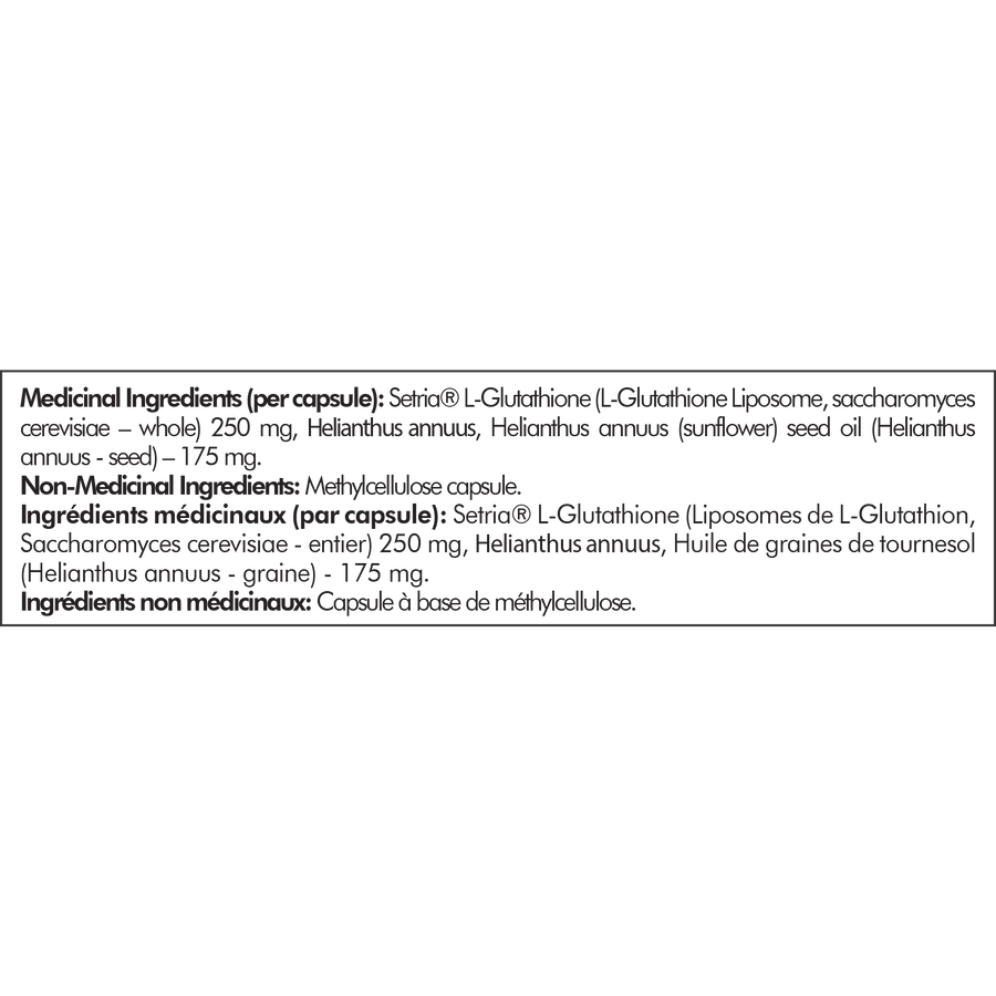 Ingredientes medicinales (por cápsula): Setria® L-Glutatión (liposoma de L-glutatión, saccharomyces cerevisiae – entero) 250 mg, Helianthus annuus, aceite de semilla de Helianthus annuus (girasol) (Helianthus annuus - semilla) – 175 mg. Ingredientes no medicinales: Cápsula de metilcelulosa.
