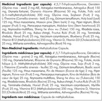 Ingredientes medicinales (por cápsula): 4',5,7-trihidroxiisoflavona, genisteína (Glycine max - semilla) 2 mg AIE, Astragalus membranaceus, astrágalo (raíz) 150 mg, Drynaria Fortunei, Drynaria rizoma (rizoma) 50 mg, folato, Ácido fólico (L-5-metiltetrahidrofolato) 300 mcg, Glycine max, Soja (Fruta) 2 mg, L-Teanina (Camellia sinensis - hoja) 25 mg, Ocimum tenuiflorum, Albahaca santa (Hoja) 125 mg, Pinus massoniana, Pino Masson (corteza del tallo) 2 mg, Piper nigrum, pimienta negra (fruta) 5 mg, Pterocarpus marsupium, Malabar kino (duramen del tallo) 25 mg, Reynoutria multiflora, Sheng he shou wu (tubérculo) 150 mg, Rhodiola rosea, Rhodiola (raíz) 25 mg, Rubus chingii, Fructus Rubi (Fruta) 35 mg, Terminalia chebula, Harad (Fruta) 25 mg, Vaccinium corymbosum, Arándano (Fruta) 25 mg, Vitamina B12 (Metilcobalamina) 250 mcg, Vitamina D, Vitamina D3 (Colecalciferol) 25 mcg, Withania somnifera, Ashwagandha (Raíz) 96 mg. Ingredientes no medicinales: Cápsula de metilcelulosa.