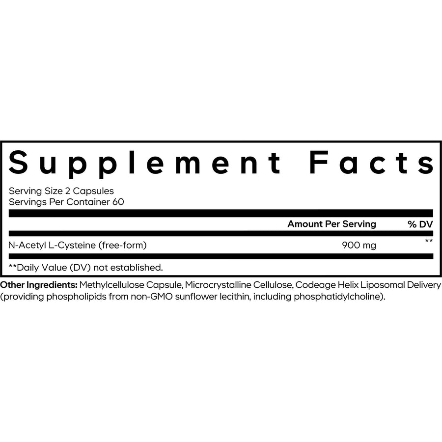 N-acetil L-cisteína (forma libre). Otros ingredientes: cápsula de metilcelulosa, celulosa microcristalina, liposomas Codeage Helix (aportando fosfolípidos procedentes de lecitina de girasol no modificada genéticamente, incluida fosfatidilcolina).