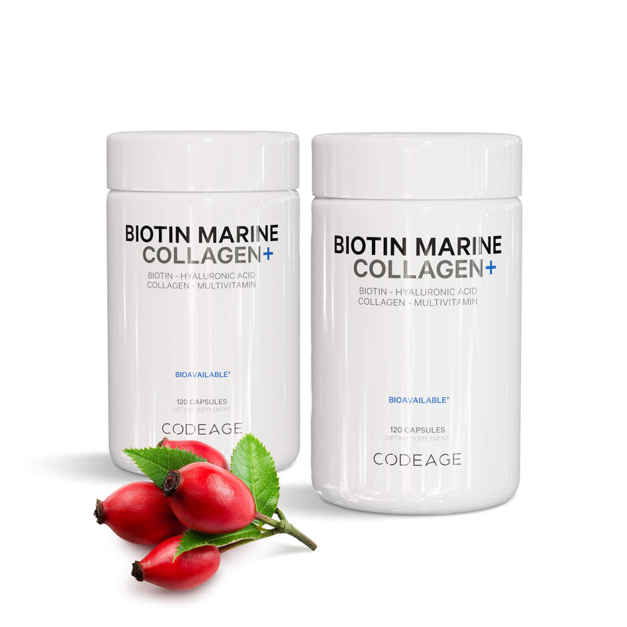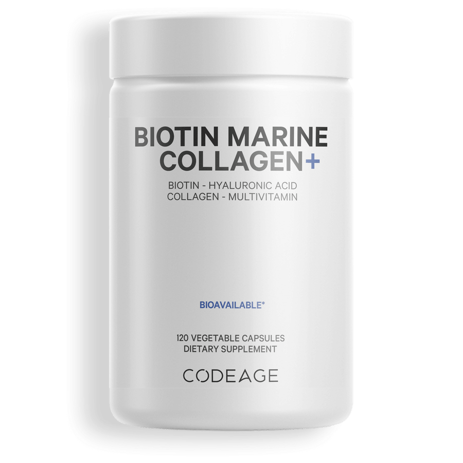 - El colágeno marino con biotina de Codeage Wild Caught contiene colágeno marino de tipo 1 y 3 y biotina, una vitamina B soluble en agua.