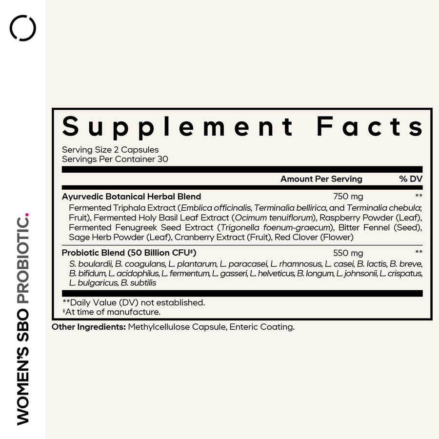 - El probiótico SBO para mujeres de Codeage ofrece una combinación cuidadosamente formulada de probióticos para la salud femenina y productos botánicos ayurvédicos formulados para el bienestar de las mujeres. Este suplemento único cuenta con 18 cepas probióticas diferentes, que brindan una potente dosis de 50 mil millones de UFC* por porción.