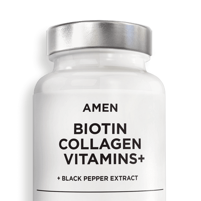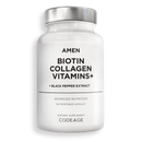 - Amen Biotina Colágeno Vitaminas+ es una fórmula avanzada de suplemento en cápsulas con una poderosa mezcla de ingredientes, que incluyen 10,000 mcg de biotina, péptidos de colágeno hidrolizados, vitamina C, vitamina E y folato.