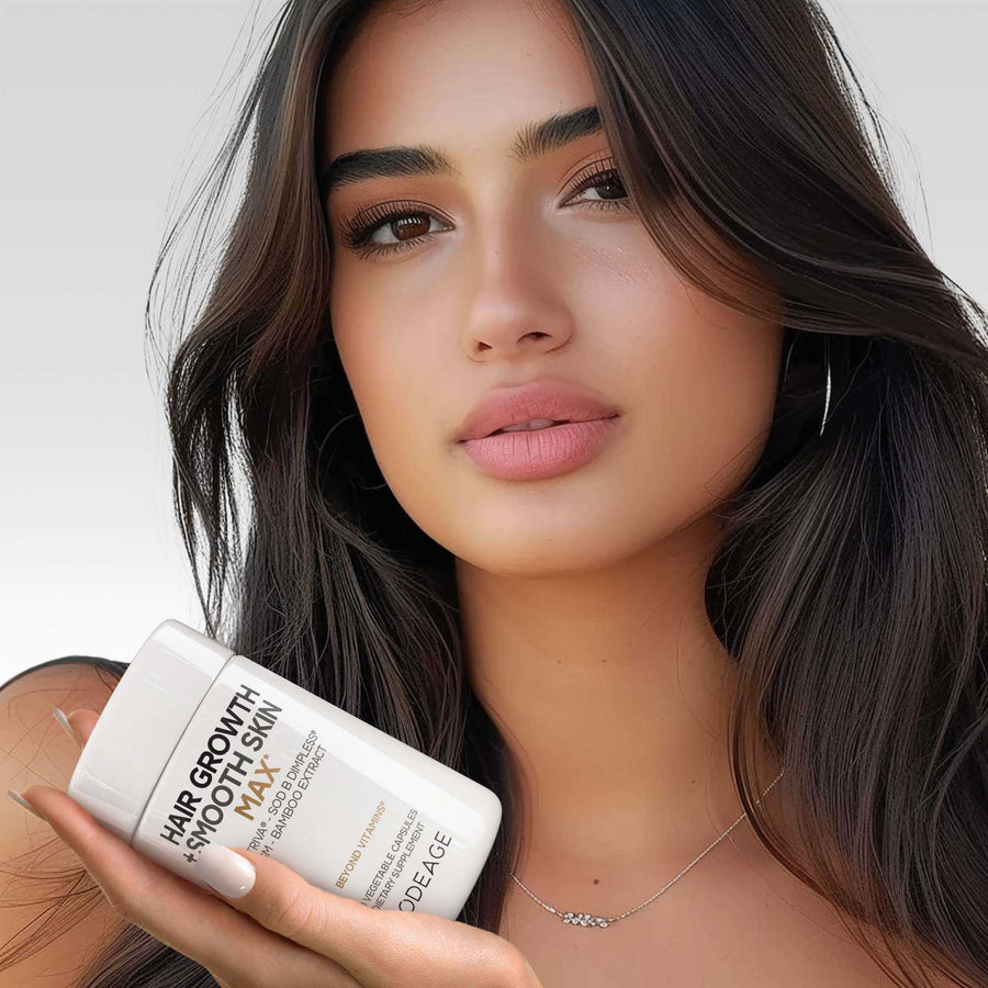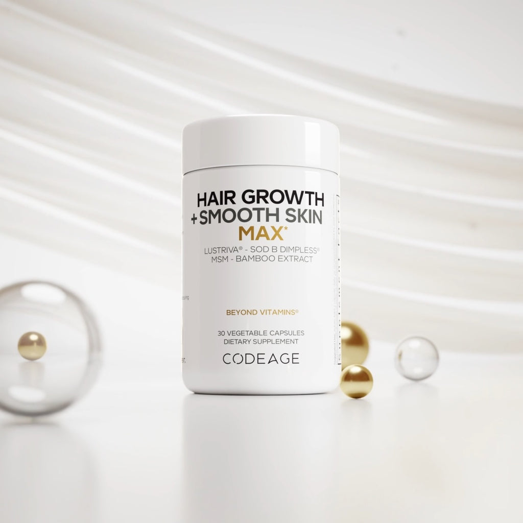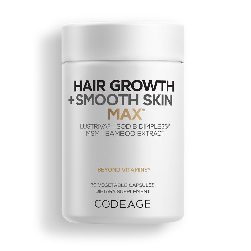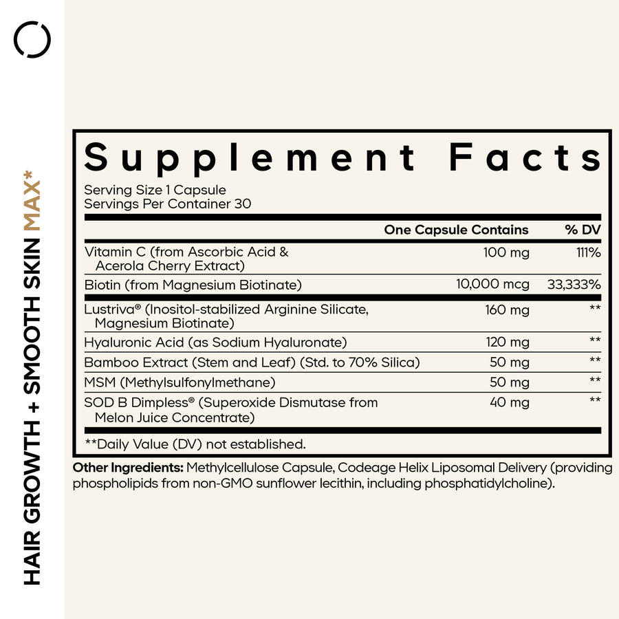 Codeage Crecimiento Capilar + Piel Suave Max incluye Lustriva®, un ingrediente clínicamente estudiado que apoya el crecimiento capilar existente para una apariencia más abundante y ayuda a mejorar el aspecto de la piel.* También contiene SOD B Dimpless®, un extracto patentado clínicamente estudiado para la salud de la piel y el apoyo contra la celulitis, junto con 10 000 mcg de biotina, vitamina C, extracto de bambú, ácido hialurónico, MSM y tecnología de liberación liposomal.*
