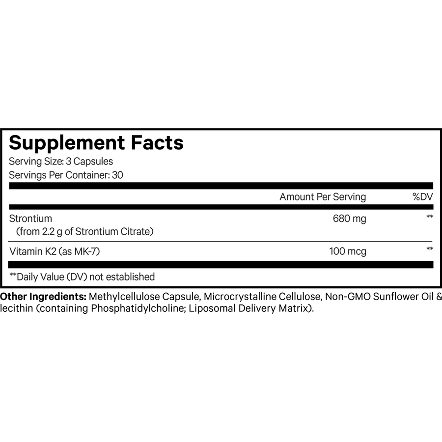 Estroncio (de 2,2 g de citrato de estroncio), vitamina K2 (como MK-7). Otros ingredientes: Cápsula de metilcelulosa, celulosa microcristalina, aceite de girasol sin OGM y lecitina (que contiene fosfatidilcolina; matriz de administración liposomal).