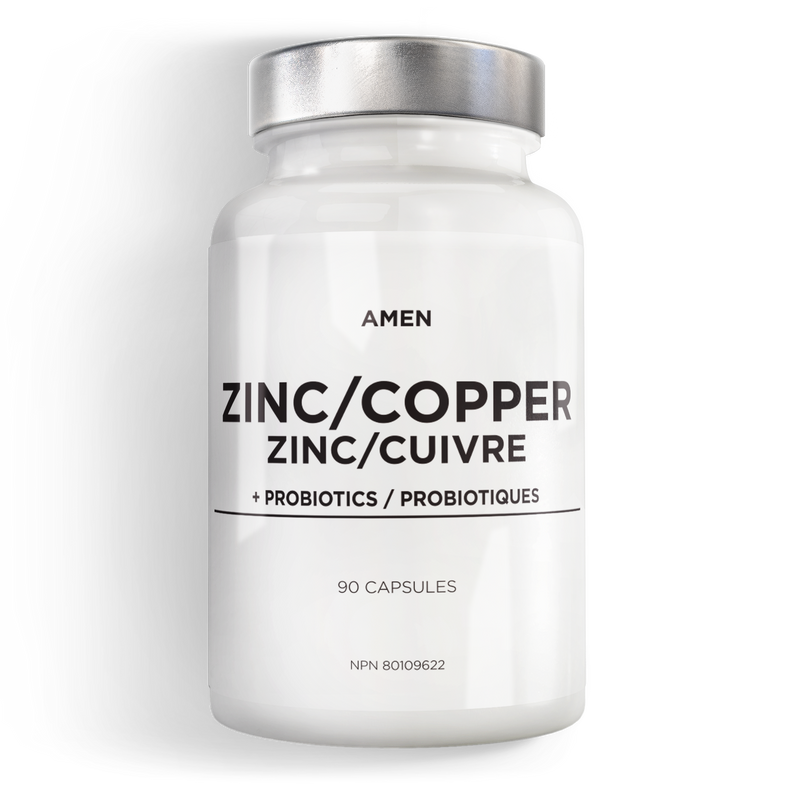 Le complément Amen Zinc Copper fournit 50 mg de bisglycinate de zinc biodisponible et de chélate de glycinate de cuivre, ainsi que 2 milliards d'UFC* de probiotiques par portion. Chaque flacon offre un approvisionnement de 3 mois avec une capsule par jour