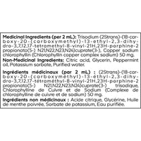 Ingrédients médicinaux (par goutte) : Trisodium (2Strans)-(18-carboxy-20-(carboxymethyl)-13-ethyl-2,3-dihydro-3,7,12,17-tetramethyl-8-vinyl-21H,23H-porphine-2 propionato(5-) N21,N22,N23,N24)cuprate(3-), Chlorophylline de cuivre sodique (Complexe de chlorophylline de cuivre sodique) 50 mg. Ingrédients non médicinaux : Acide citrique, Glycérine, Huile de menthe poivrée, Sorbate de potassium, Eau purifiée.