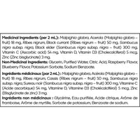 Ingrédients médicinaux (par goutte) : Malpighia glabra, Acérola (Malpighia glabra – fruit) 18 mg, Ribes nigrum, Cassis (Ribes nigrum – fruit) 50 mg, Sambucus nigra subsp. nigra, Sureau noir (Sambucus nigra subsp. nigra – fruit) 300 mg, Vitamine C (Acide ascorbique) 54 mg, Vitamine D, Vitamine D3 (Cholécalciférol) 5 mcg, Zinc (Bisglycinate de zinc) 3 mg. Ingrédients non médicinaux : Glycérine, eau purifiée, acide citrique, arôme de framboise, arôme de myrtille, sorbate de potassium, benzoate de sodium.