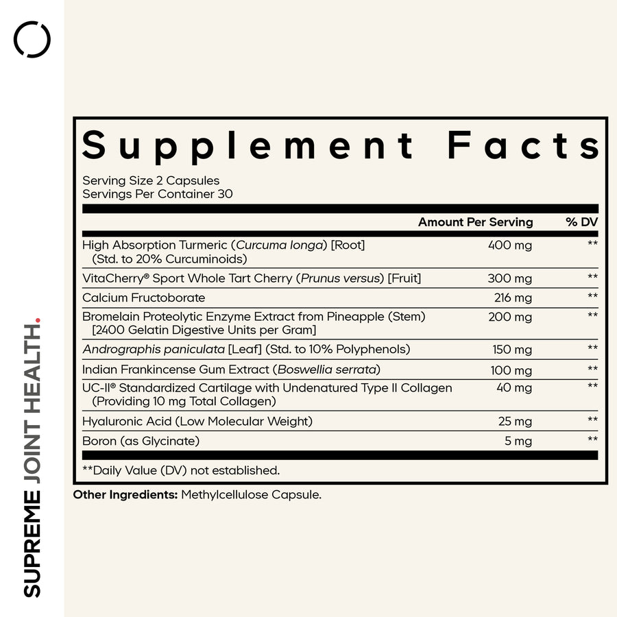 - Codeage Supreme Joint Health est un supplément formulé de manière complexe contenant du collagène UC-II® et de la cerise acidulée entière VitaCherry® Sport. Ce mélange synergique offre 10 mg de collagène de type 2 non dénaturé et 300 mg d'extrait de cerises acidulées entières VitaCherry® Sport par portion.