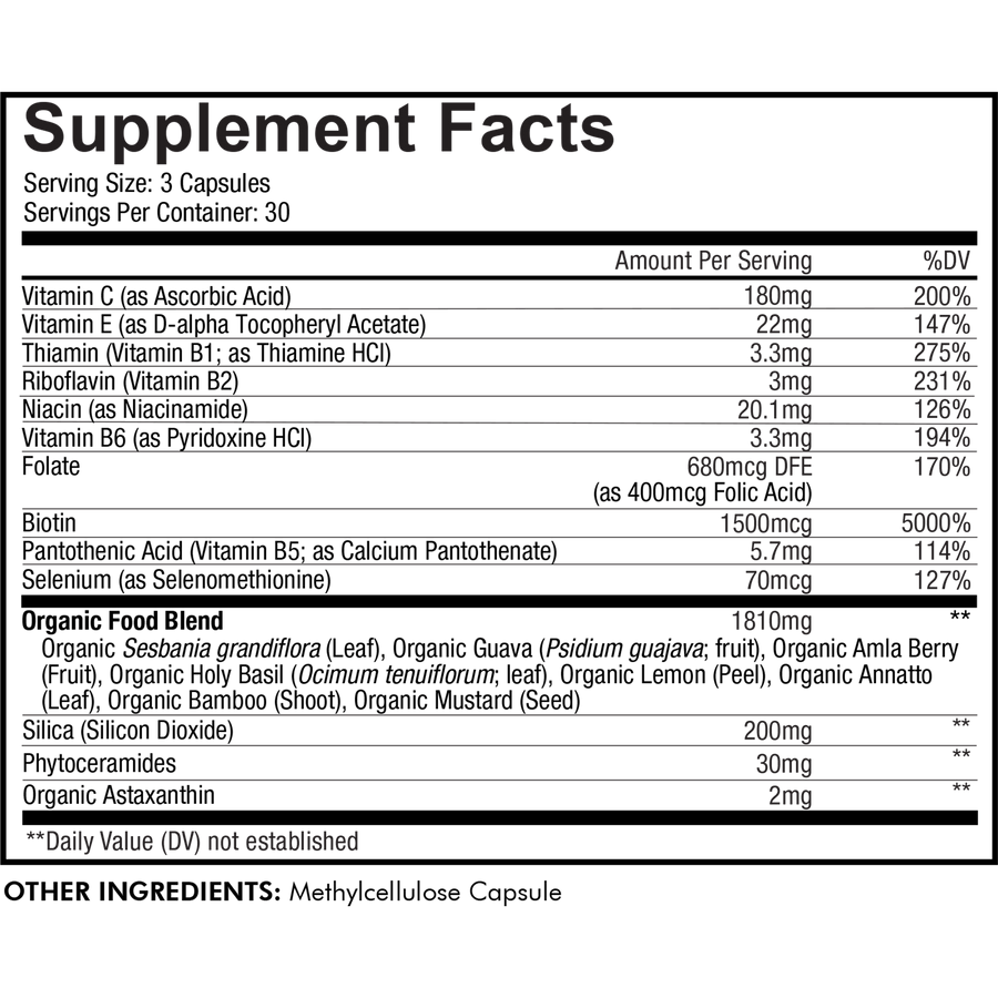 Vitamine C (sous forme d'acide ascorbique), vitamine E (sous forme d'acétate de d-alpha tocophérol), thiamine (vitamine B1 ; sous forme de thiamine HCI), riboflavine (vitamine B2), niacine (sous forme de niacinamide), vitamine B6 (sous forme de pyridoxine HCI), folate. (sous forme d'acide folique), biotine, acide pantothénique (vitamine B5 ; sous forme de pantothénate de calcium), sélénium (sous forme de sélénométhionine), mélange d'aliments biologiques : Sesbania grandiflora biologique (feuille), goyave biologique (Psidium guajava ; fruit), baie d'Amla biologique (fruit ), Basilic sacré biologique (Ocimum tenuiflorum ; feuille), Citron biologique (zeste), Annatto biologique (feuille), Bambou biologique (pousse), Moutarde biologique (graine), Silice (dioxyde de silicium), Phytocéramides, Astaxanthine biologique. Autres ingrédients : Capsule de méthylcellulose.