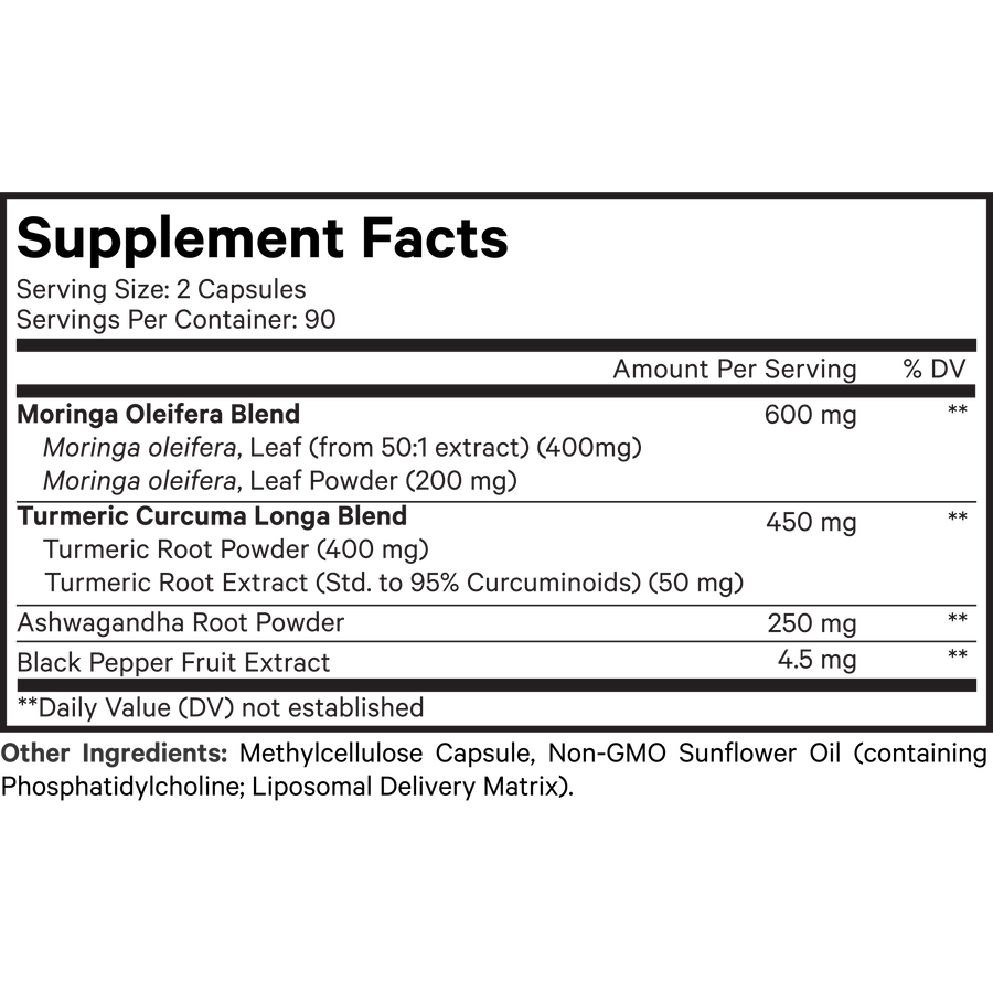 Mélange de Moringa Oleifera : Moringa oleifera, feuille (à partir d'un extrait de 50 : 1) Moringa oleifera, poudre de feuilles, curcuma Mélange de curcuma longa : poudre de racine de curcuma, extrait de racine de curcuma (standard à 95 % de curcuminoïdes), poudre de racine d'Ashwagandha, extrait de fruit de poivre noir . Autres ingrédients : Capsule de méthylcellulose, huile de tournesol sans OGM (contenant de la phosphatidylcholine ; matrice de délivrance liposomale).
