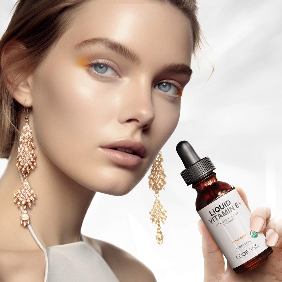 - Codeage Supplément Liquide De Vitamine E combine la vitamine E (sous forme d'acétate de D-alpha-tocophérol) avec de l'huile de triglycéride à chaîne moyenne (MCT) biologique et de l'huile d'orange biologique.