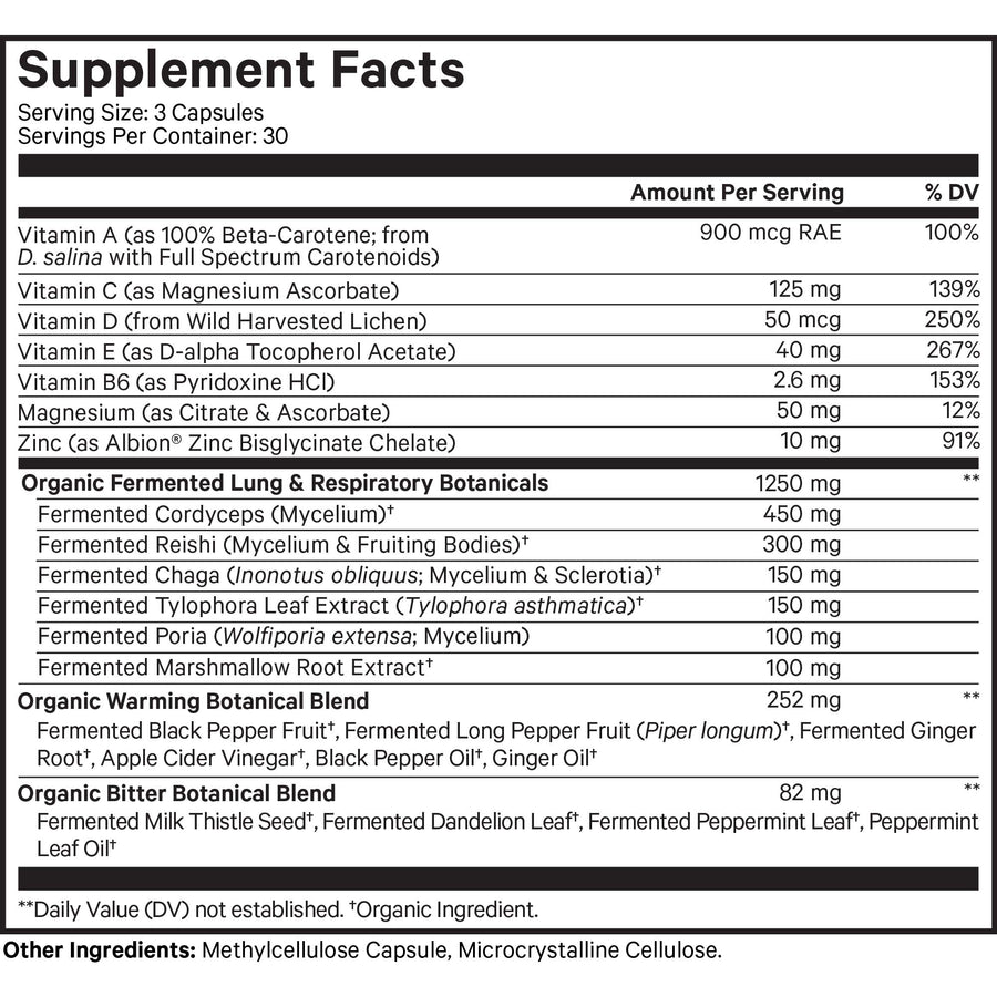 Vitamine A (sous forme de bêta-carotène à 100 % ; provenant de D. salina avec caroténoïdes à spectre complet), vitamine C (sous forme d'ascorbate de magnésium), vitamine D (provenant de lichen sauvage), vitamine E (sous forme de tocophérols mélangés D-Alpha), vitamine B6. (sous forme de pyridoxine HCl), zinc (sous forme de chélate d'acides aminés), magnésium (sous forme de citrate et d'ascorbate) ; Poumons et plantes respiratoires fermentés biologiques : Cordyceps fermentés (mycélium), reishi fermenté (mycélium et corps fruitiers), chaga fermenté (Inonotus obliquus ; mycélium et sclérotes), extrait de feuille de Tylophora fermenté (Tylophora asthmatica), Poria fermenté (Wolfiporia extensa ; mycélium) , Extrait de racine de guimauve fermentée ; Mélange botanique réchauffant biologique : fruits de poivre noir fermentés, fruits de poivre long fermentés (Piper longum), racine de gingembre fermentée, vinaigre de cidre de pomme, huile de poivre noir, huile de gingembre ; Mélange botanique amer biologique : graines de chardon-Marie fermentées, feuille de pissenlit fermentée, fermentée, feuille de menthe poivrée, huile de feuille de menthe poivrée.