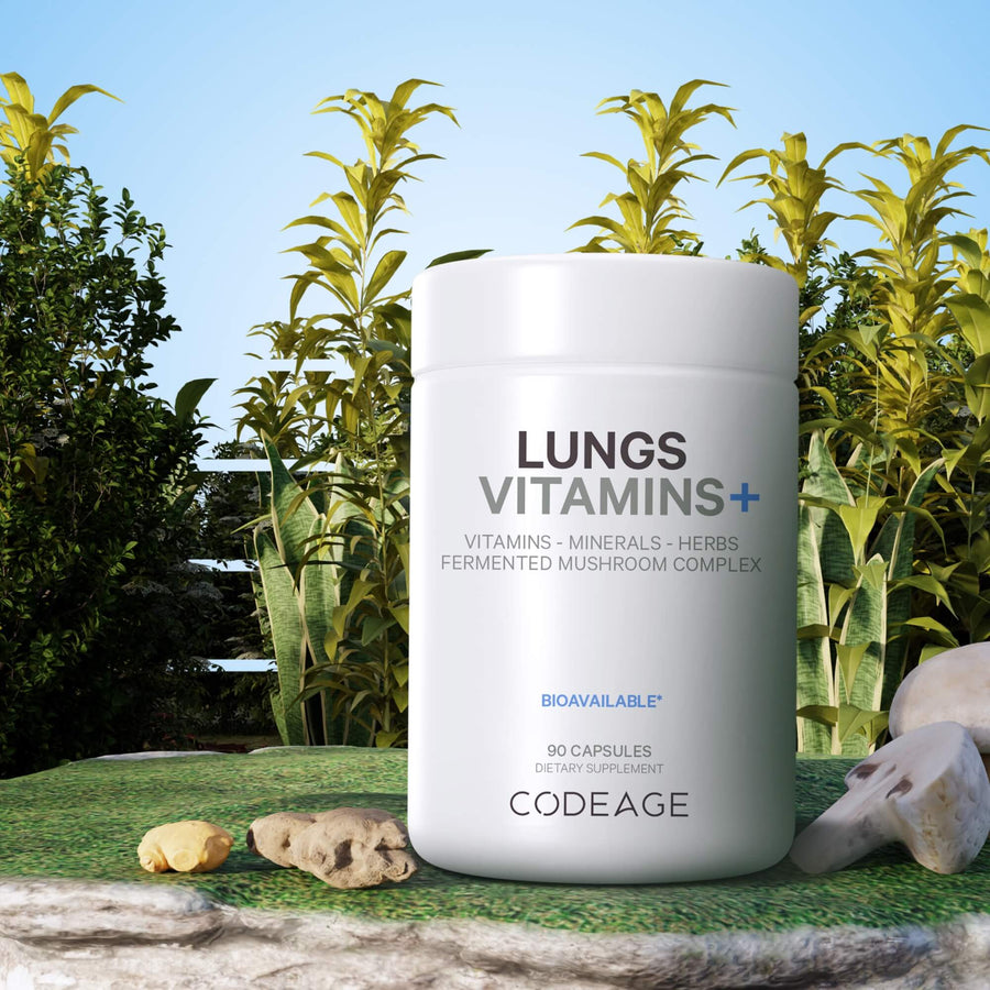 Codeage Lungs Vitamins+ combine les vitamines essentielles A, B6, C, D3 et E avec un mélange de minéraux, de plantes et d'ingrédients fermentés, notamment des champignons biologiques comme le cordyceps et le reishi, du chardon-Marie fermenté et une variété d'extraits de plantes.