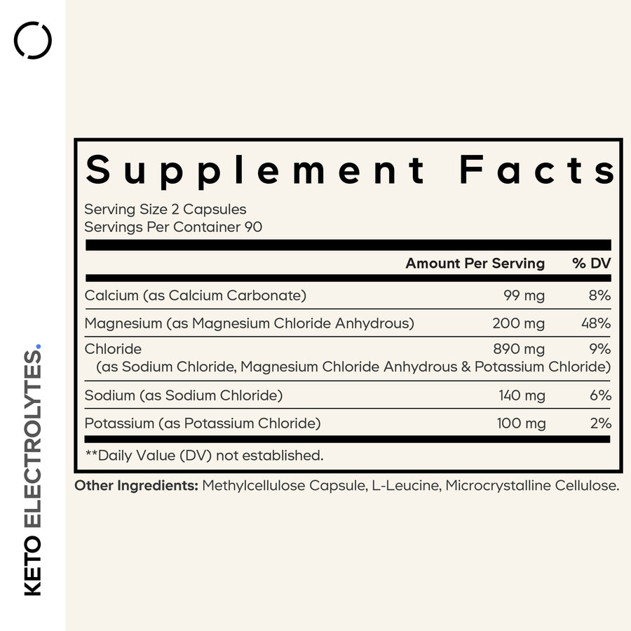 Calcium (sous forme de carbonate de calcium), magnésium (sous forme de chlorure de magnésium anhydre), chlorure (sous forme de chlorure de sodium, de chlorure de magnésium anhydre et de chlorure de potassium), sodium (sous forme de chlorure de sodium), potassium (sous forme de chlorure de potassium). Autres ingrédients : capsule de méthylcellulose, L-leucine, cellulose microcristalline.