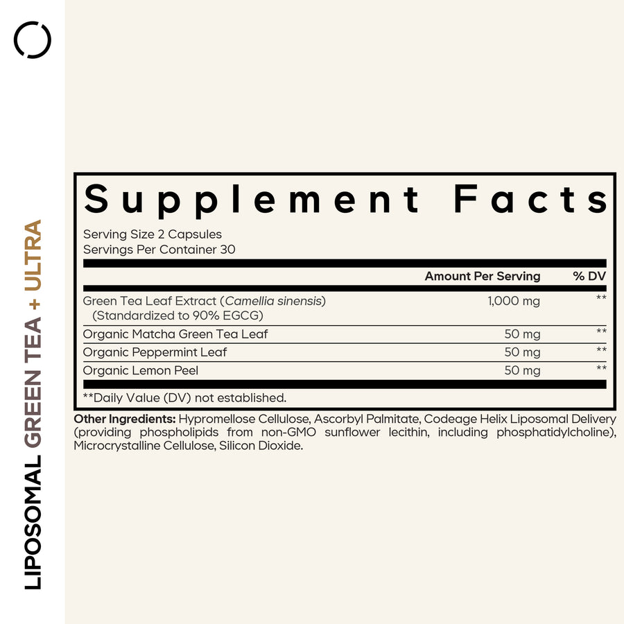 - Codeage Thé vert liposomal+ Ultra fournit un extrait de thé vert standardisé à 90 % d'EGCG pour une expérience de thé vert améliorée et ultra premium.