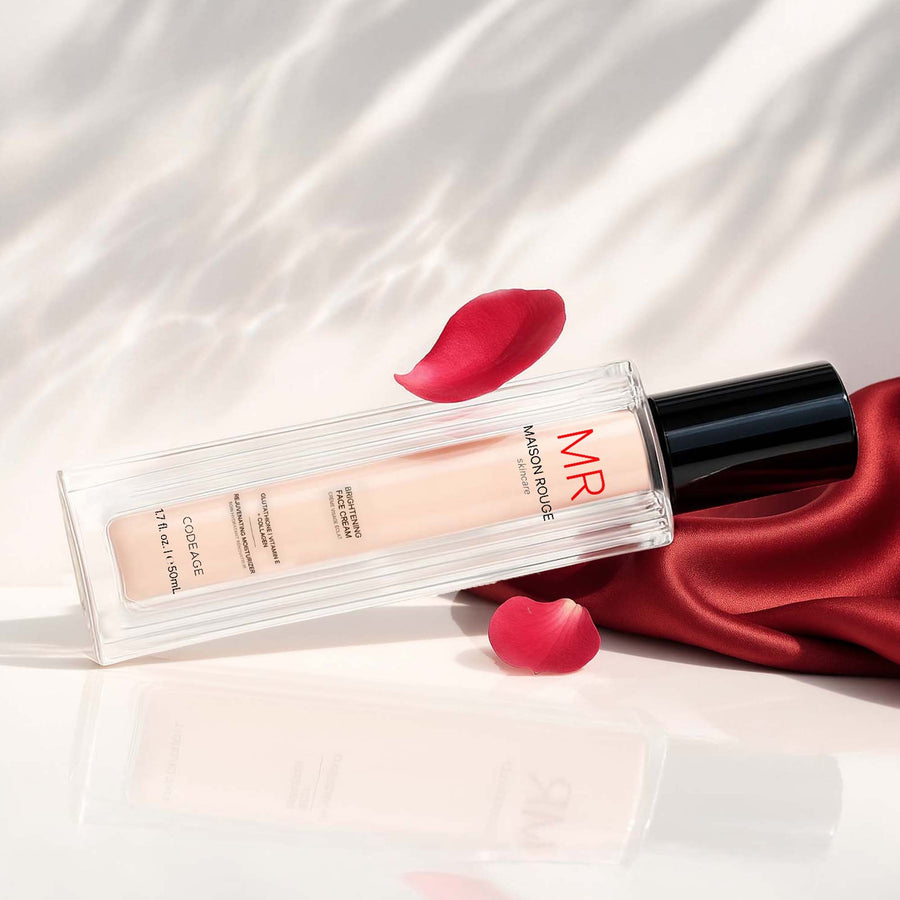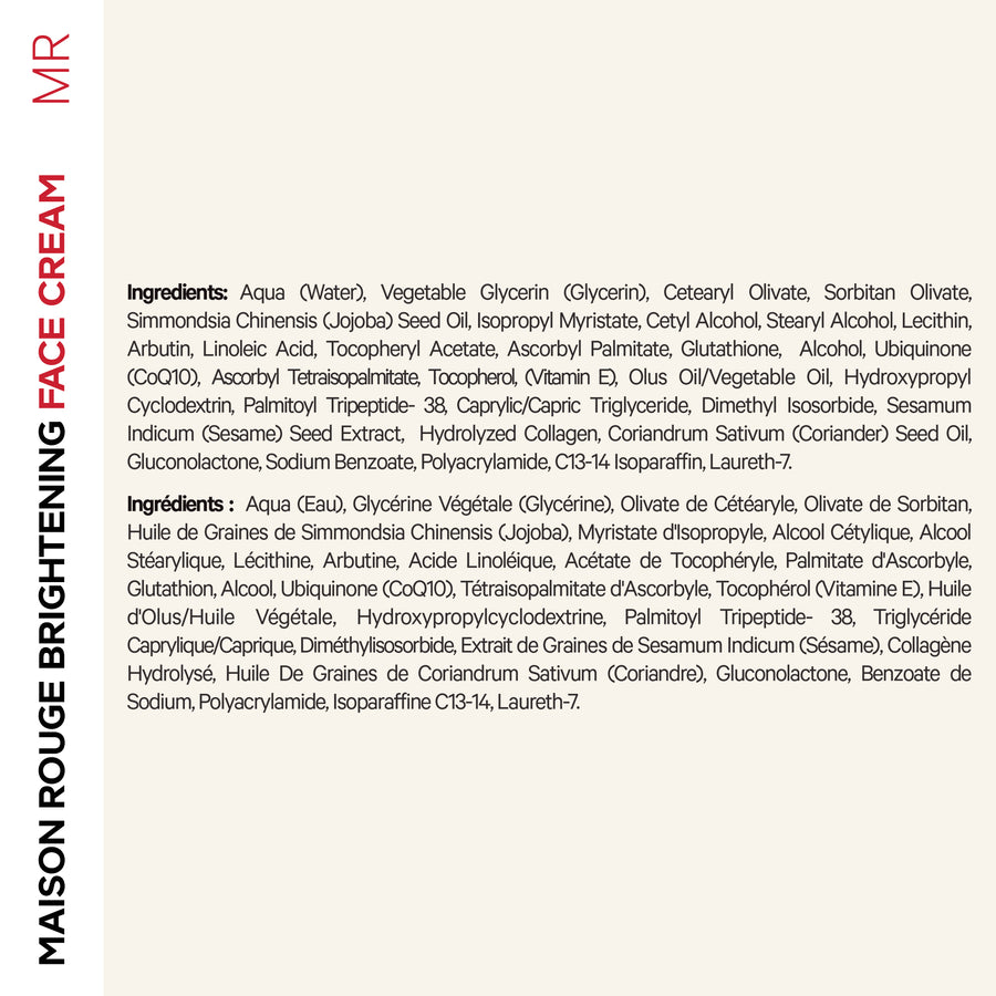 - La crème visage éclaircissante Maison Rouge est conçue pour améliorer l'éclat grâce au glutathion, à la vitamine E, au collagène et à la coenzyme Q10.