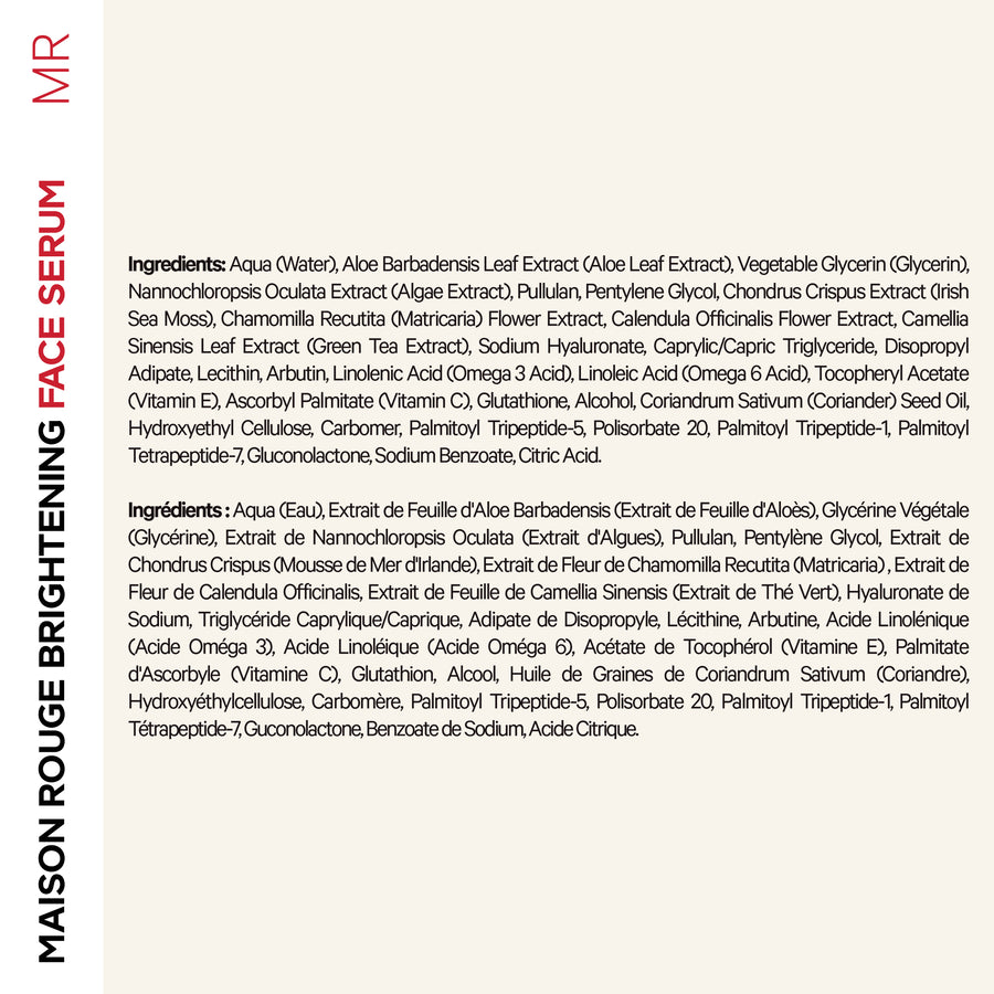 - Le sérum éclaircissant pour le visage Maison Rouge est formulé pour aider à soutenir l'éclat naturel de votre peau avec du glutathion, de la vitamine C, de la vitamine E, de l'acide hyaluronique et des peptides de collagène.* Ce sérum au collagène et à la vitamine C convient à tous les types de peau.