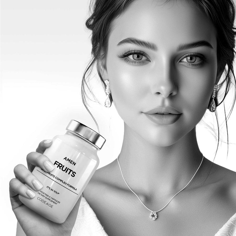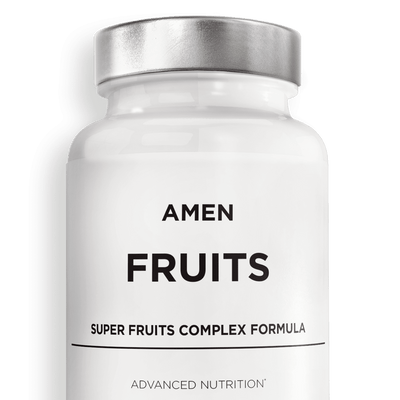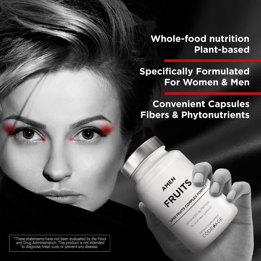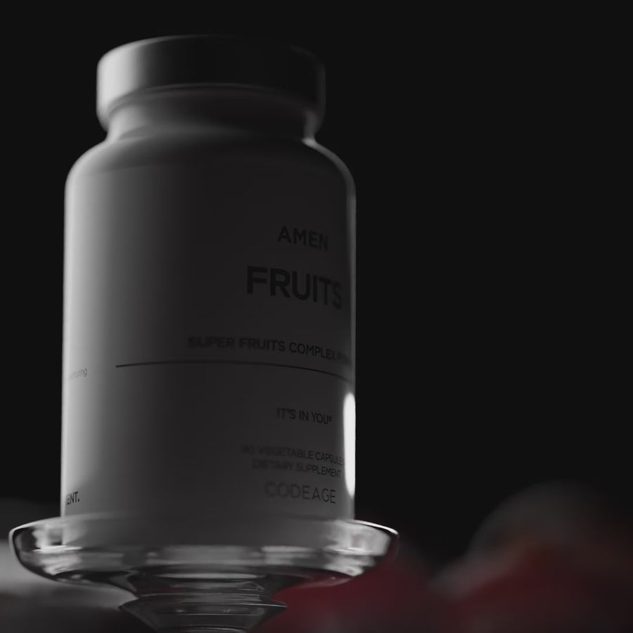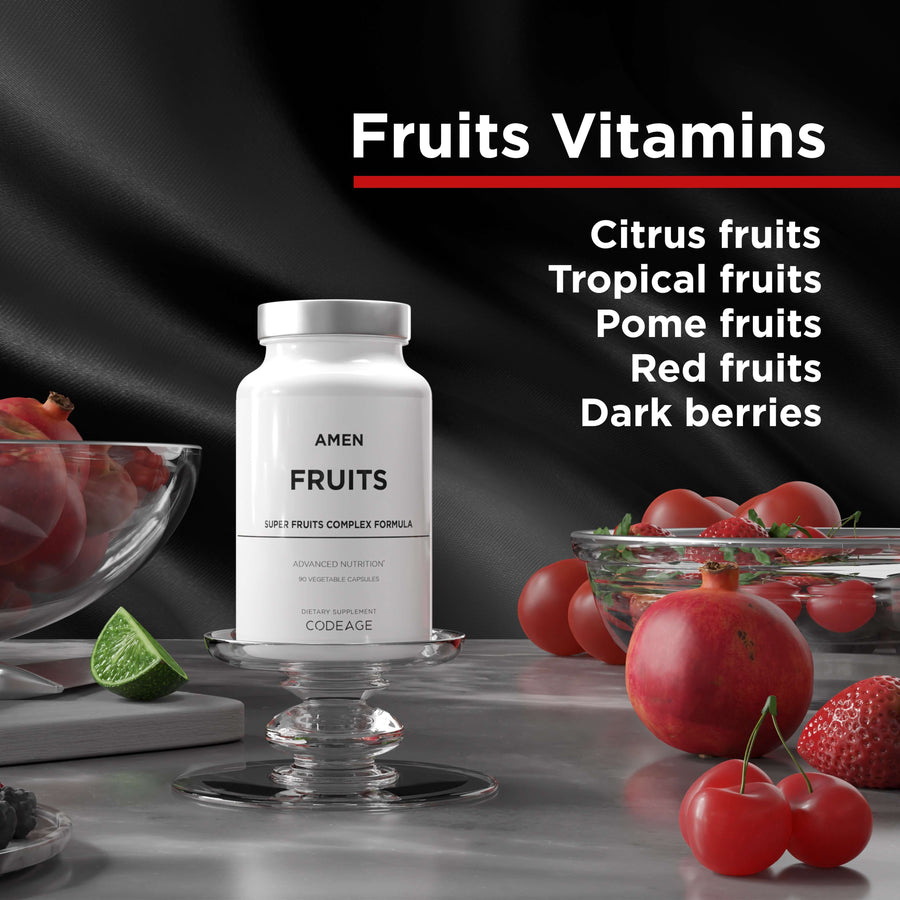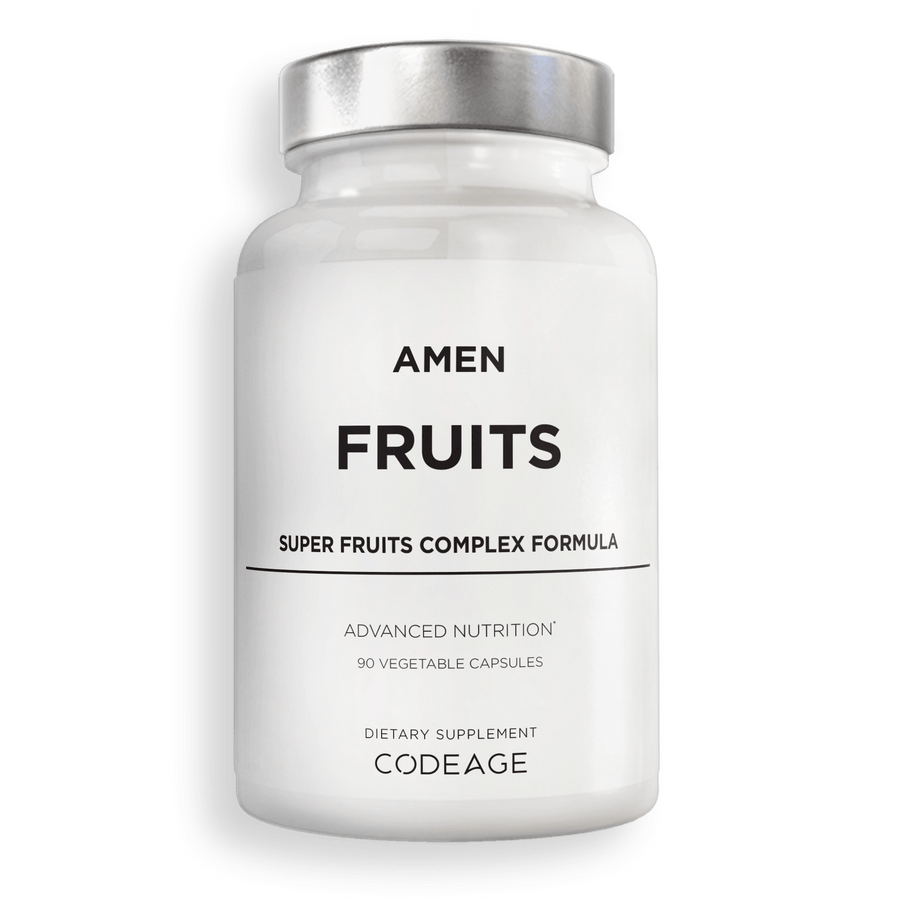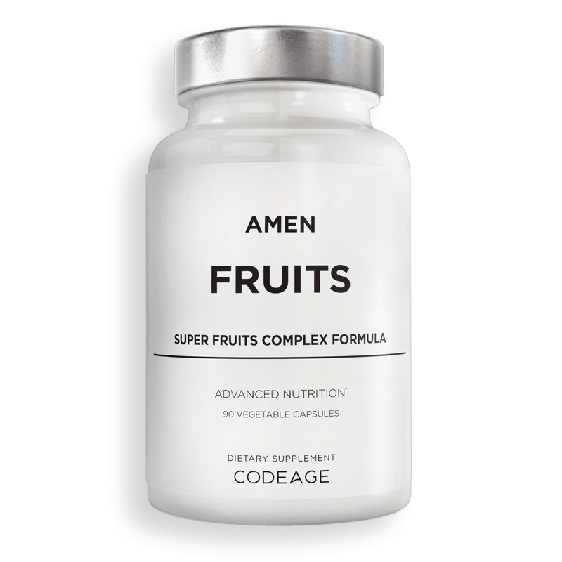 Amen Fruits capsules formula is a vegan supplement that contains a diverse blend of raw whole fruits and berries, including citrus & tropical fruits, pome fruits, red fruits, and dark berries. Enriched with red superfoods such as acai, pomegranate, and black currant, this daily multivitamin offers a convenient way to incorporate whole-food ingredients into your diet.