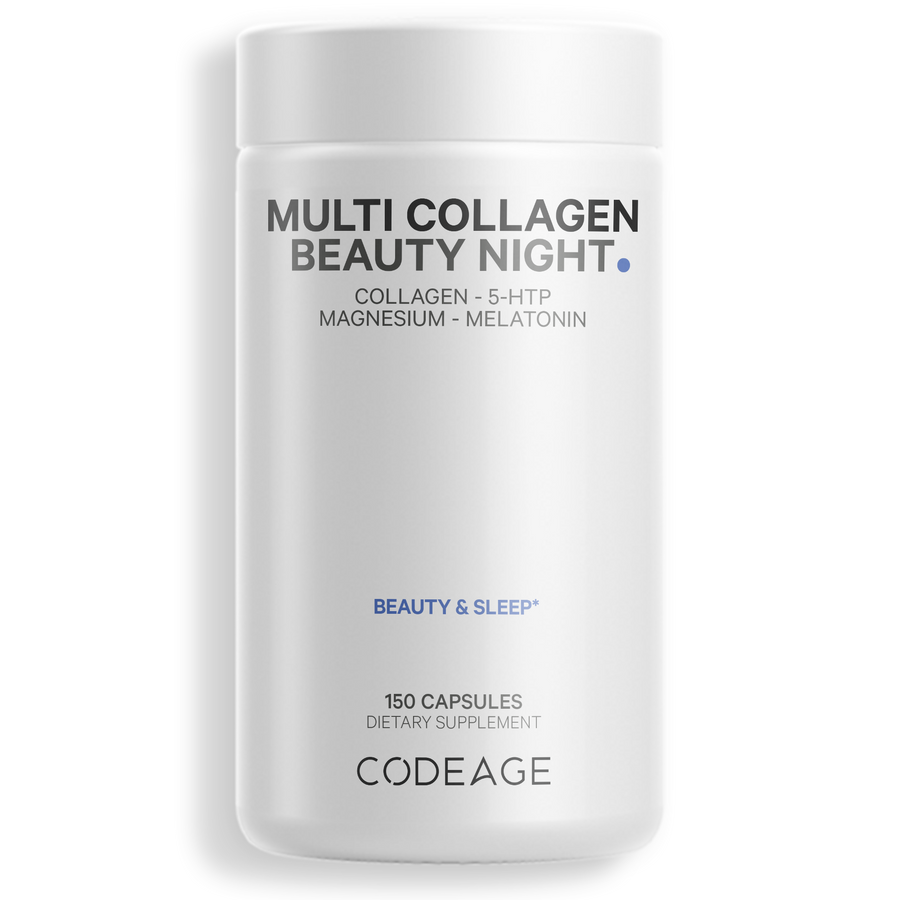 Codeage Multi Collagen Beauty Night combines 5 types of collagen (I, II, III, V, X) sourced from grass-fed bovine collagen, organic chicken and beef bone broth, wild-caught fish collagen, and eggshell membrane collagen. This advanced formula includes melatonin, 5-HTP, L-theanine, English lavender powder, and magnesium bisglycinate chelate.