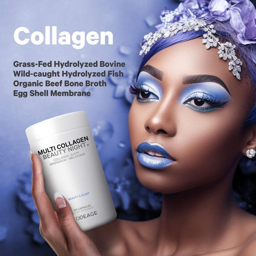 Experience Codeage Multi Collagen Beauty Night, an advanced all-in-one collagen supplement featuring 5 collagen types, melatonin, magnesium glycinate, 5-HTP, L-theanine, and lavender.