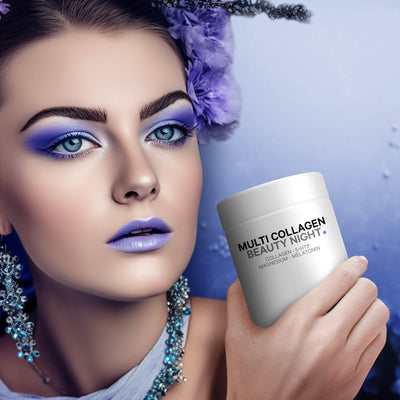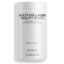 Experience Codeage Multi Collagen Beauty Night, an advanced all-in-one collagen supplement featuring 5 collagen types, melatonin, magnesium glycinate, 5-HTP, L-theanine, and lavender.