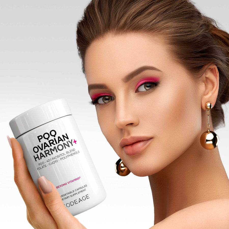 Codeage PQQ Ovarian Harmony+ supplement is designed to support women's wellness with a unique blend of Myo-Inositol, D-Chiro-Inositol, folate as 5-MTHF, CoQ10, and Pyrroloquinoline Quinone (PQQ). Enhanced with wild blueberry and pomegranate extracts, this formula also features a liposomal delivery.