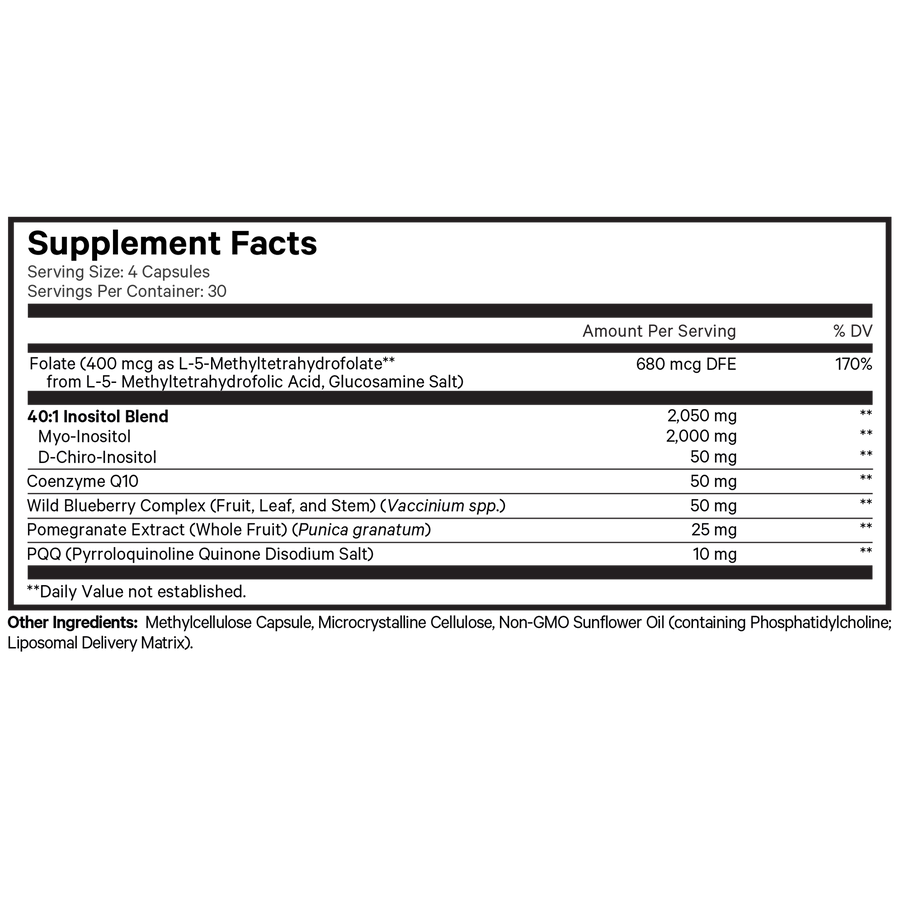 Folate (400 mcg as L-5-Methyltetrahydrofolate** from L-5- Methyltetrahydrofolic Acid, Glucosamine Salt), 40:1 Inositol Blend: Myo-lnositol, D-Chiro-Inositol; Coenzyme Q10, Wild Blueberry Complex (Fruit, Leaf, and Stem) (Vaccinium spp.), Pomegranate Extract (Whole Fruit) (Punica granatum), PQQ (Pyrroloquinoline Quinone Disodium Salt). Other Ingredients: Methylcellulose Capsule, Microcrystalline Cellulose, Codeage Helix Liposomal Delivery (providing phospholipids from non-GMO sunflower lecithin, including phosphatidylcholine).